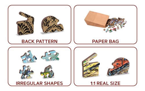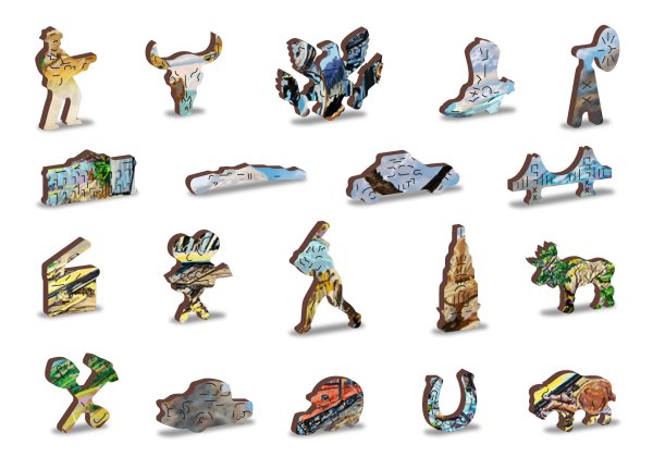 s unikátně tvarovanými dílky představující známé stavby, předměty nebo zvířata podle tématu motivu vyšší obtížnost při menším počtu dílků - skládání puzzle s různotvarými dílky je náročnější oboustranné puzzle 2v1 - z jedné strany je obrázek, z druhé opakující se vzor pro skládání podle tvaru hladké hrany bez třísek díky preciznímu laserovému zpracování vyrobeno z pevné dřevovláknité HDF desky o síle 3-4mm uvnitř balení je samostatná předloha na skládání EKO Friendly 100% bez plastových obalů - puzzle je v papírovém sáčku uvnitř papírové krabičky vhodný dárek pro jakoukoliv příležitost