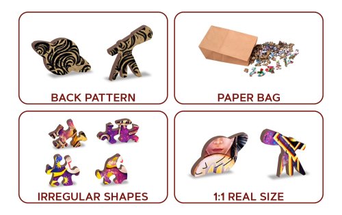 s unikátně tvarovanými dílky představující známé stavby, předměty nebo zvířata podle tématu motivu vyšší obtížnost při menším počtu dílků - skládání puzzle s různotvarými dílky je náročnější oboustranné puzzle 2v1 - z jedné strany je obrázek, z druhé opakující se vzor pro skládání podle tvaru hladké hrany bez třísek díky preciznímu laserovému zpracování vyrobeno z pevné dřevovláknité HDF desky o síle 3-4mm uvnitř balení je samostatná předloha na skládání EKO Friendly 100% bez plastových obalů - puzzle je v papírovém sáčku uvnitř papírové krabičky vhodný dárek pro jakoukoliv příležitost