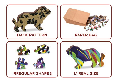 s unikátně tvarovanými dílky ve tvaru zvířat vyšší obtížnost při menším počtu dílků - skládání puzzle s různotvarými dílky je náročnější hladké hrany bez třísek díky preciznímu laserovému zpracování vyrobeno z pevné dřevovláknité HDF desky o síle 3-4mm uvnitř balení je samostatná předloha na skládání EKO Friendly 100% bez plastových obalů - puzzle je v papírovém sáčku uvnitř papírové krabičky vhodný dárek pro jakoukoliv příležitost