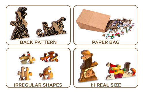 s unikátně tvarovanými dílky představující známé stavby, předměty nebo zvířata podle tématu motivu vyšší obtížnost při menším počtu dílků - skládání puzzle s různotvarými dílky je náročnější oboustranné puzzle 2v1 - z jedné strany je obrázek, z druhé opakující se vzor pro skládání podle tvaru hladké hrany bez třísek díky preciznímu laserovému zpracování vyrobeno z pevné dřevovláknité HDF desky o síle 3-4mm uvnitř balení je samostatná předloha na skládání EKO Friendly 100% bez plastových obalů - puzzle je v papírovém sáčku uvnitř papírové krabičky vhodný dárek pro jakoukoliv příležitost