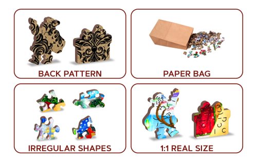s unikátně tvarovanými dílky představující známé stavby, předměty nebo zvířata podle tématu motivu vyšší obtížnost při menším počtu dílků - skládání puzzle s různotvarými dílky je náročnější oboustranné puzzle 2v1 - z jedné strany je obrázek, z druhé opakující se vzor pro skládání podle tvaru hladké hrany bez třísek díky preciznímu laserovému zpracování vyrobeno z pevné dřevovláknité HDF desky o síle 3-4mm uvnitř balení je samostatná předloha na skládání EKO Friendly 100% bez plastových obalů - puzzle je v papírovém sáčku uvnitř papírové krabičky vhodný dárek pro jakoukoliv příležitost