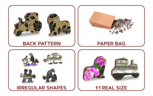 s unikátně tvarovanými dílky představující známé stavby, předměty nebo zvířata podle tématu motivu vyšší obtížnost při menším počtu dílků - skládání puzzle s různotvarými dílky je náročnější oboustranné puzzle 2v1 - z jedné strany je obrázek, z druhé opakující se vzor pro skládání podle tvaru hladké hrany bez třísek díky preciznímu laserovému zpracování vyrobeno z pevné dřevovláknité HDF desky o síle 3-4mm uvnitř balení je samostatná předloha na skládání EKO Friendly 100% bez plastových obalů - puzzle je v papírovém sáčku uvnitř papírové krabičky vhodný dárek pro jakoukoliv příležitost