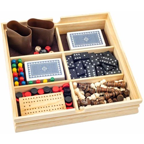 Několik stolních her v jednom dřevěném boxu Šachy, dáma, člověče nezlob se, vrchcáby, backgammon, mlýn, kameny pro domino, kostky a karty Obsahuje i návody ke hrám