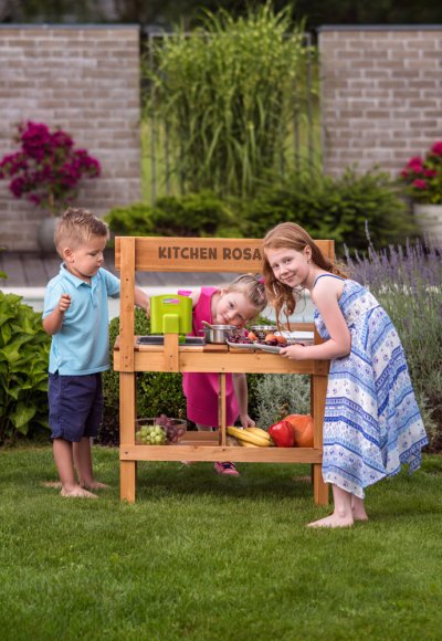 Z jedné strany kuchyňka se dvěma vařiči, z druhé výdejna jídel Součástí kuchyňky je zásobník na vodu Díky němuž může dítě skutečně omývat ovoce, zeleninu, ale i nádobí a náčiní, které je součástí tohoto výrobku Hra s vodou děti nadchne a plnění zásobníku se tak stane velmi populární činností Dřez pod kohoutkem je vyjímatelný a může se tak vylévat dle potřeby Pod dřezem je prostor pro uskladnění zásob na přípravu pokrmů Na černou tabulku z výdejní strany kuchyně mohou děti napsat či nakreslit, jaké jídlo dnes pro své kamarády připravily Zahradní kuchyňka je ošetřená glazurou vhodnou pro děti a je šetrná k životnímu prostředí