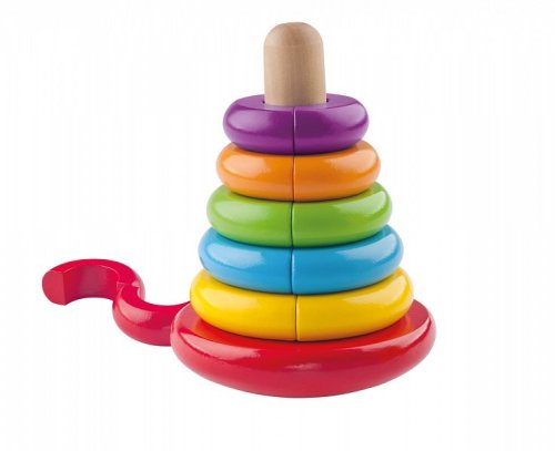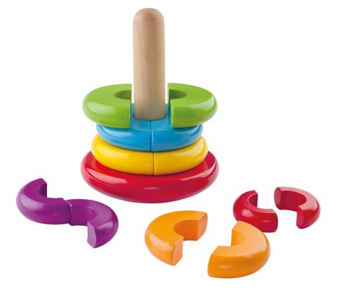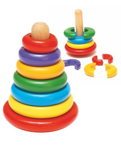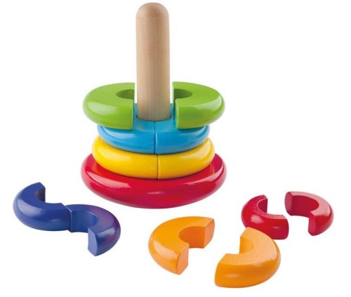 Úkolem dítěte je navléknout kroužky od největšího k nejmenšímu Každý navlékací kroužek je tvořen dvěma půlkruhy spojenými silným magnetem Dítě si musí nejprve půlkruhy spojit a pak je navléknout na tyčku