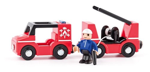 Hasičské auto v barvách českých záchranných složek Doplněné figurkou hasiče s pohyblivými klouby Grafický design českých výtvarníků Vhodné jako příslušenství k vláčkodráhám WOODY Kompatibilní i s ostatními vláčkodráhami nabízenými na našem trhu