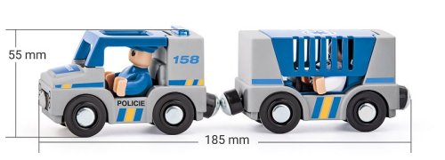 Policejní vozidlo v barvách českých záchranných složek Doplněné o plastové doplňky a figurky s pohyblivými klouby Grafický design českých výtvarníků Vhodné jako příslušenství k vláčkodráhám WOODY Kompatibilní i s ostatními vláčkodráhami nabízenými na našem trhu
