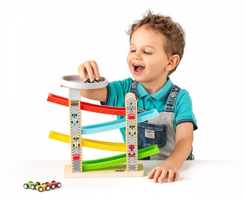 Hračka pro nejmenší Dítě umístí autíčka na horní plochu dráhy, naklopí ji a autíčka sjedou po dráze dolů Rozvoj jemné motoriky a koordinace oko-ruka