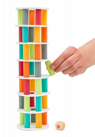 Úkolem dítěte je postavit věž z válečků a kroužků tak, jak ji vidí na obrázku Pak může hra začít Každý z hráčů postupně vytahuje válečky z věže tak, aby věž stále držela pohromadě Komu věž první spadne, prohrává Hra je určena pro 2 hráče, z nichž může být jeden rodič a druhý dítě