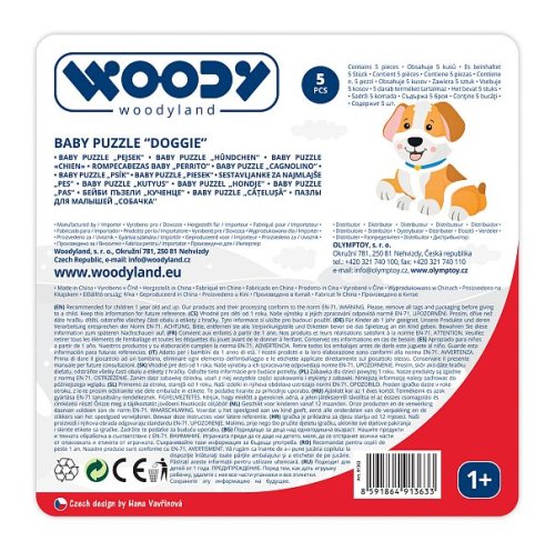 Masivní puzzle pro nejmenší děti Složeno z pěti velkých kousků, které se dají snadno uchopit Na základně hrací desky vytištěna černobílá kresba Ta usnadní orientaci a správné poskládání obrázku Design pochází z dílny českého výtvarníka