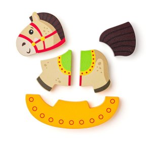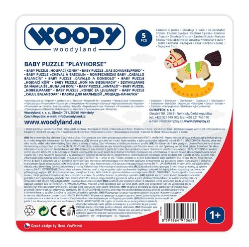Masivní puzzle pro nejmenší děti Složeno z pěti velkých kousků, které se dají snadno uchopit Na základně hrací desky vytištěna černobílá kresba Ta usnadní orientaci a správné poskládání obrázku Design pocházíz dílny českého výtvarníka