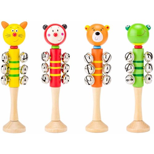 6 rolniček umístěných na dřevěné hůlce s hlavičkou zvířátka Zvuk rolniček rozezvučí každou písničku Hračka rozvíjí rytmus a hudební sluch