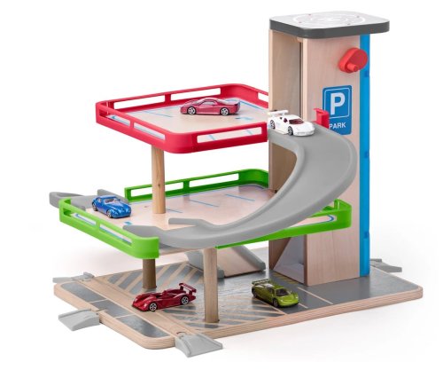 Dřevěná garáž s výtahem je skvělá zábava pro malé motoristy Jednoduše zajeďte se svým autíčkem do výtahu, nechte se vyvézt do nejvyššího patra a zaparkujte nebo si sjeďte o patro níže Garáž má tři úrovně nastavitelnosti výtahu Výtah lze jednoduše mechanicky posouvat nahoru a dolů díky otočnému kolečku