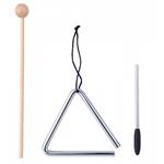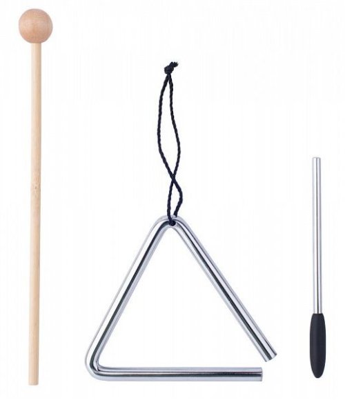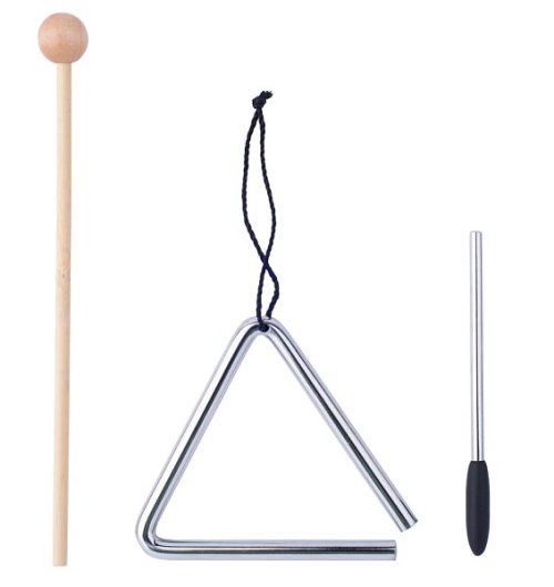 Dalším zástupcem bicích nástrojů je triangl U jednoho z vrcholů je rozdělen kvůli lepší rezonanci Při hře je třeba jej zavěsit na prsty provázkem a tak zabránit tlumení tónů Do trianglu se ťuká paličkou obsaženou v této sadě Délka tónu se může regulovat zatlumením prsty