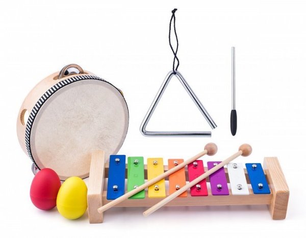V tomto hudebním setu jsou zastoupeny nástroje několika skupin Bicí nástroje zde zastupuje xylofon Jeho kovové plátky jsou usazeny na filcových kroužcích, které regulují ostrost zvuku Dřevěný rám i paličky propůjčují zvuku hloubku a sametový tón