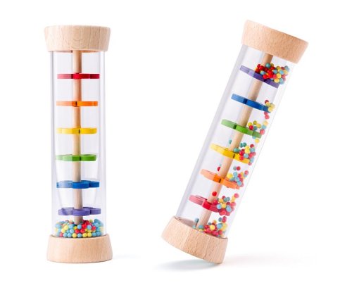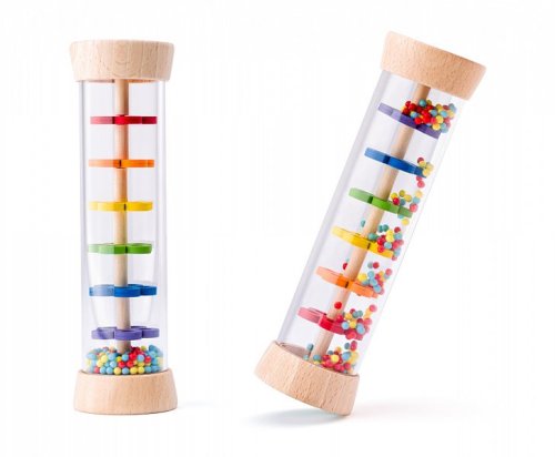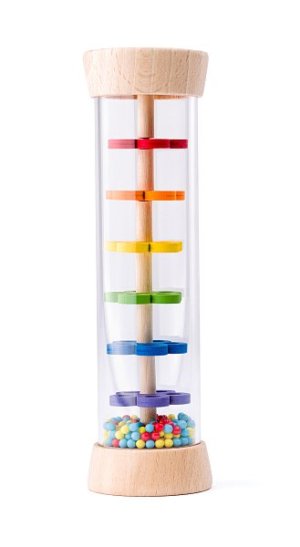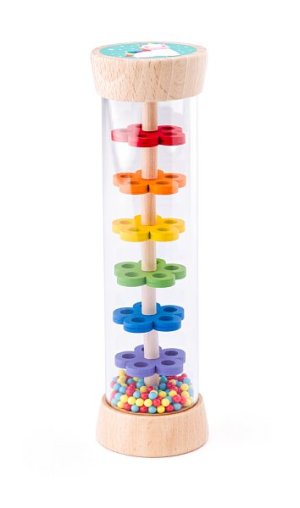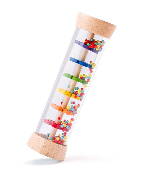 Překlápěním válce propadají duhové korálky skrz kaskádu překážek Chrastí a vytváří pro dítě zábavnou podívanou