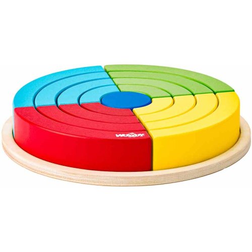 Dřevěná skládačka pro nejmenší Dítě skládá z duhových částí oblouků kola Ty pak skládá od středu od nejmenších po největší Pokud vše správně poskládá, bude výsledkem kruh skládající se ze čtvrtin 4 různých barev Součástí výrobku je dřevěná podložka jako základna Podporuje rozvoj jemné motoriky, logiky a kombinatoriky