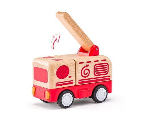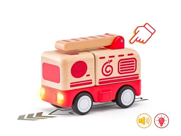 Autíčko se setrvačníkem Vyrobeno z pevného masivního dřeva Určeno přesně do malé dětské ruky Je vybaveno světlem a zvukem Žebřík na střeše autíčka je vyklápěcí Baterie 3x LR44 1,5V jsou součástí
