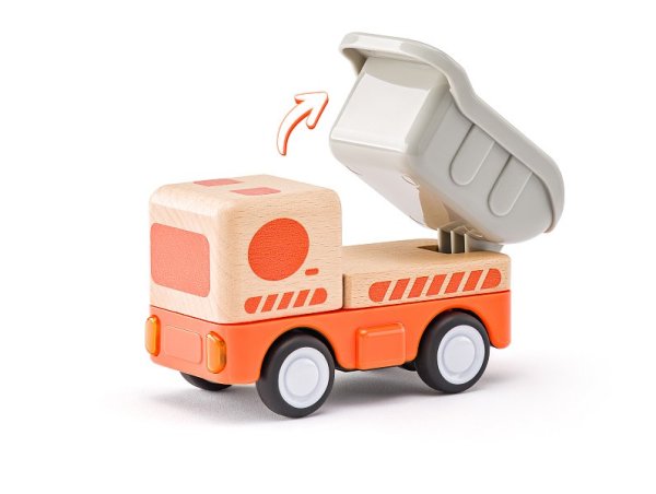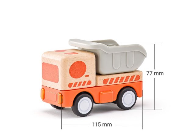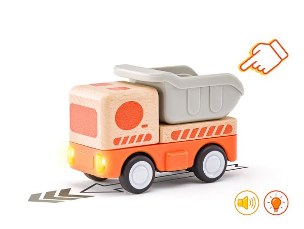 Autíčko se setrvačníkem Vyrobeno z pevného masivního dřeva Určeno přesně do malé dětské ruky Je vybaveno světlem a zvukem Plastová korbička na střeše autíčka je vyklápěcí Baterie 3x LR44 1,5V jsou součástí