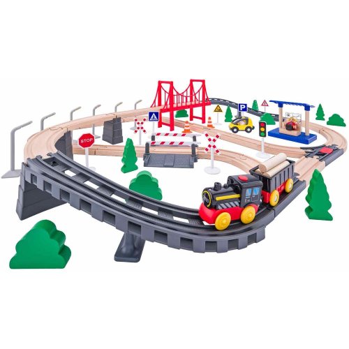 Víceúrovňová vláčkodráha s lanovým mostem a kombinací kolejí dřevo/plast Sestava obsahuje elektrickou mašinku, plastové autíčko, vlakovou zastávku, 2 figurky a další příslušenství Dráhu lze postavit pokaždé jinak a jednotlivé díly je možné kombinovat i s ostatními vláčkodráhami dostupnými na našem trhu
