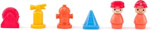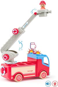 hasičské auto je vyrobeno v kombinaci kvalitního plastu a dřeva Obsahuje 2 figurky hasičů a 4 kusy hasičského vybavení Má pohyblivý žebřík (otáčí se, vysunuje se, sklápí se; plošinu lze sklánět) Zmáčknutím tlačítka na kabině se aktivuje světlo a zvuk Šňůrka na tahání Vhodné pro děti od 18 měsíců Provoz na baterie 3x AG13,LR44 1,5V (součást balení)