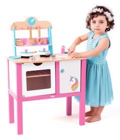 Kuchyňka s motivem jednorožce obsahuje velké množství příslušenství (hrnec, pánev, slánka, pepřenka, naběračka, poklice,....). Má otvírací dveře, otočné ovládací knoflíky a otočné ručičky u hodin. Kuchyňku dodáváme v rozloženém stavu. Jednoduchá montáž dle přiloženého montážního plánu. Výrobek je vyroben z kombinace kvalitní překližky a dřeva. Sada obsahuje 17 ks příslušenství.