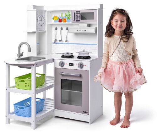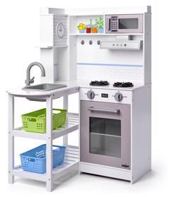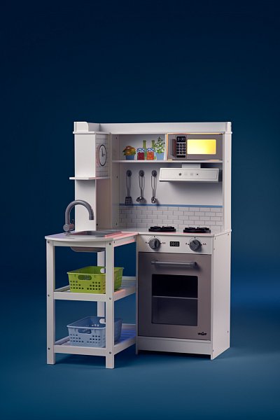 Kuchyňská linka se zvukovými a světelnými efekty. Po zatížení hrncem se plotýnka podsvítí červeným světlem a ozve se zvuk bublající vody. Po zmáčknutí tlačítka na digestoři se na jeho spodní straně rozsvítí světlo. Svým jednoduchým designem a bílou barvou se kuchyňka hodí do každého dětského pokojíku. | Věk: 3+ | Rozměr: 64 x 99 x 101 cm | Výška pracovní desky: 53 cm|