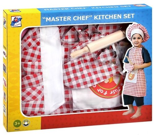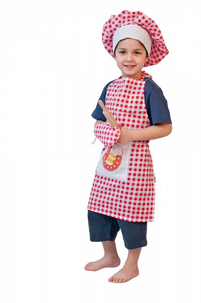 Obsah balení: kuchyňská zástěra, čepice na suchý zip (nastavitelný obvod hlavy), chňapka, dřevěný váleček a 4 kovová vykrajovátka.