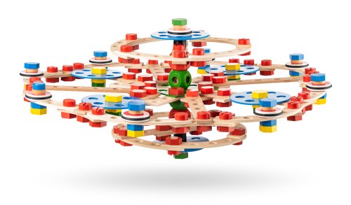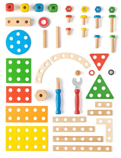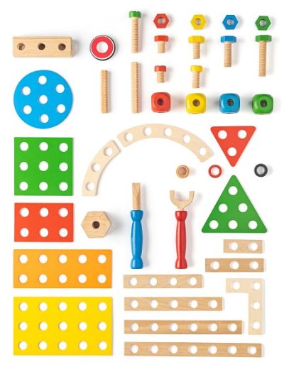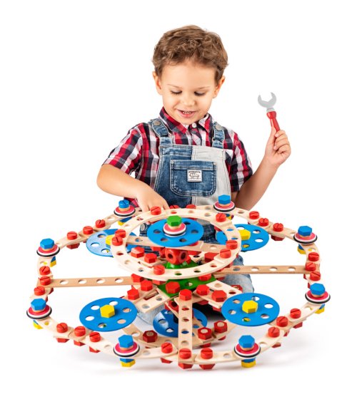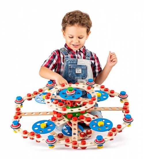 Montážní stavebnice "Engeneer" nabízí dětem konstrukční hru s nekonečným množstvím variant různých staveb od strojů a dopravních prostředků přes domečky , jeřáby až po létající talíře, mosty, věže atd. Obsahuje obrovské množství vysoce kvalitních dřevěných dílů ( dřevěné destičky v různých tvarech, matice, šrouby, kolečka, podložky, šroubovák a montážní klíč, atd...), se kterými se snadno pracuje a které po zatažení šroubů vytvoří pevnou konstrukci. Věk: 3+. Velikost dílku se 6ti dírkami: 22 cm, velikost obdélníkové destičky: 18,5 x 11 cm. Počet ks: 340