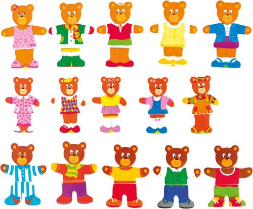Oblíbená dřevěná "oblékací" skládačka pro malé děti s medvědí rodinkou. Vyměňujte s dětmi postavičkám hlavy, tělo a nožičky a kombinujte oblečení pro různé příležitosti. Balení obsahuje 57 dílků.