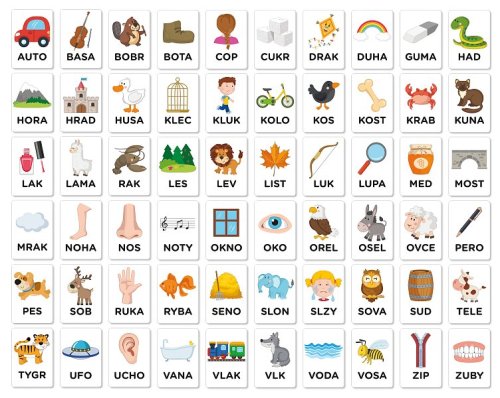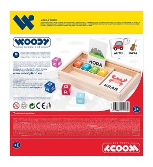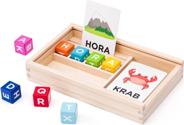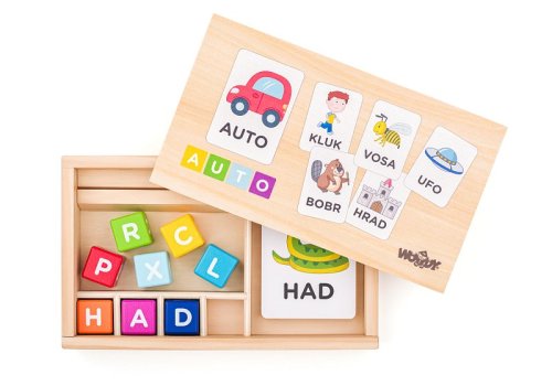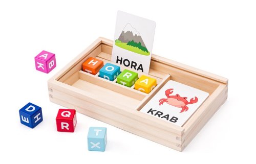 Hra Poskládej slova představuje smysluplné poznávání písmen a skládání slov. Dítě si vybere obrázek s krátkým názvem a zasune ho do stojánku. Na barevných kostičkách se pak snaží najít jednotlivá písmena a správně je poskládat.