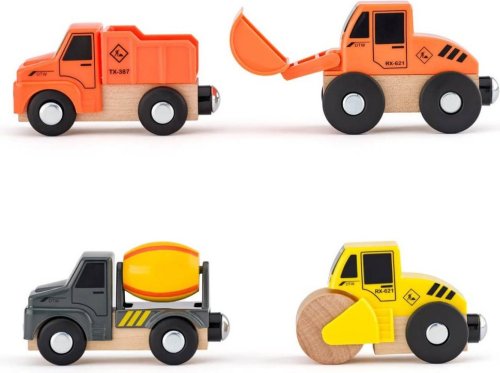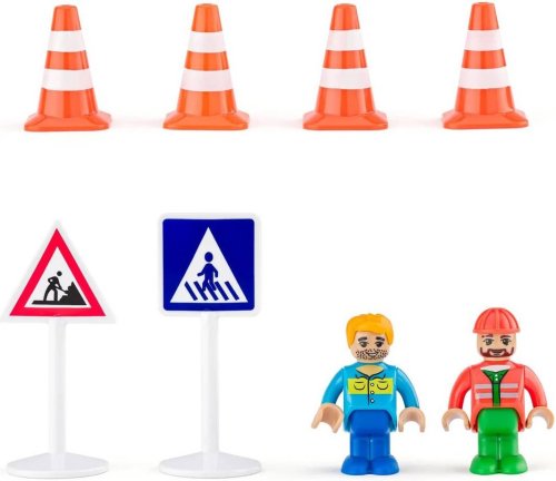 4 autíčka, 1 vozík, 2 plastové figurky, 4 výstražné kužely, 2 dopravní značky nákladní auto, bagr, míchací auto, silniční válec možnost připojení pomocí magnetů