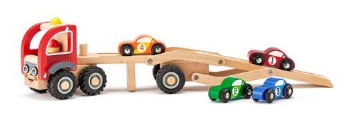 Praktický tahač s návěsem pro malé řidiče od značky Woody. Tahač, návěs i auta jsou vyrobeny z tvrdého masivního dřeva. Patrová plošina pro auta se dá sklopit tak, aby auta mohla najet a zase sjet z rampy. Tahač a návěs se dají odpojit.