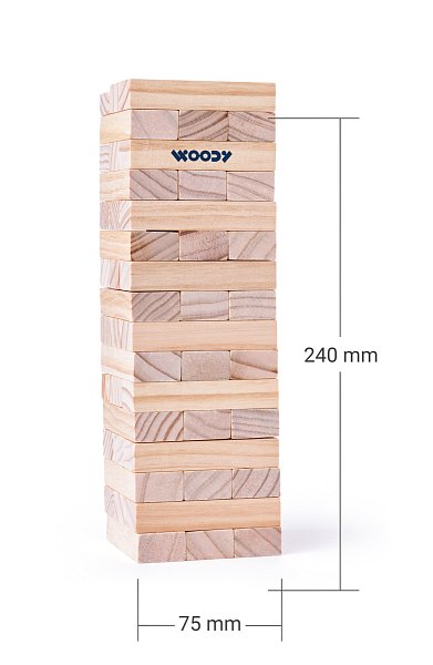 Dřevěná věž je vysoká 24 cm. Rozměr jednoho dílku je 7,5 x 2,5 x 1,5 cm.