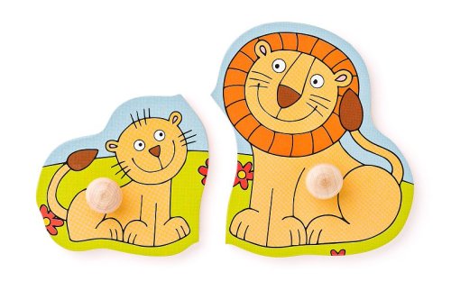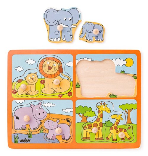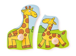 Každý obrázek tvoří dvojice zvířátek. Dvojička je rozdělena napůl a skládá se ze dvou dílků. Jednotlivé dílky mají velké dřevěné úchytky pro snazší manipulaci a pomáhají při vkládání dílků do otvorů.