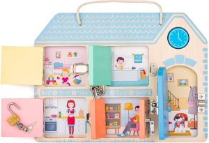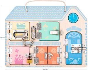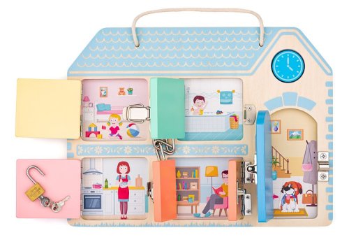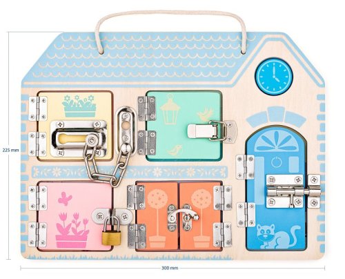 Procvič si šikovnost svých malých prstíků! Děti mohou otevírat a zavírat jednotlivé místnosti a procvičovat si jemnou motoriku. Dvířka jsou opatřena nejrůznějšími zámkovými mechanismy. Otevíratelné části mají odlišné barvy, hračka tedy slouží i jako pomůcka pro rozpoznávání barev. Za každými dvířky je ilustrace znázorňující odlišné místnosti i členy domácnosti. V horní části domečku je ouško pro pohodlné přenášení nebo zavěšení. Součástí je i kovový klíček. Design od české návrhářky Hany Vavřinové. Rozměry domečku jsou cca 30 x 22,5 cm. Vhodné pro děti od 3 let.