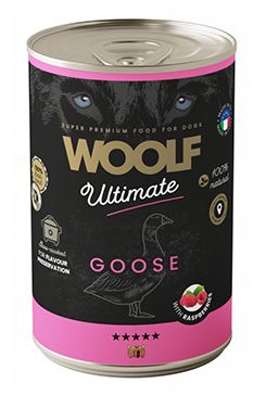 Kompletní krmivo pro dospělé psy, vlhké krmivo s husím masem a malinami.