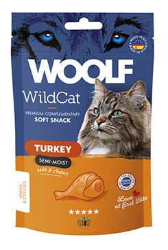Doplňkové polovlhké krmivo pro kočky, pamlsek s příchutí krůtího masa.