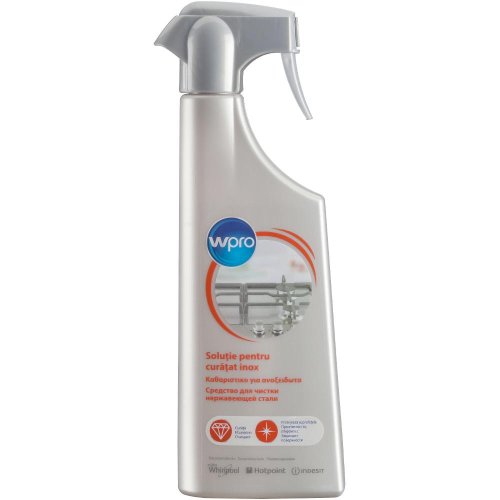 Č Čisticí sprej na nerez a chrom Wpro SSC 213 účinně a bez poškrábání čistí a chrání. Na nich tvoří voděodolný ochranný film proti viditelným stopám. Sprej má objem 500 ml a je určen na údržbu všech nerezových spotřebičů.