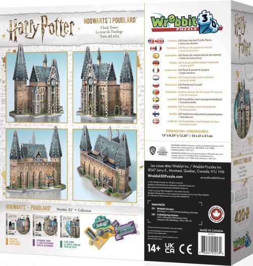Sova ti nepřinesla pozvánku do Bradavické školy čar a kouzel? Nezoufej, postav si vlastní Bradavice doma! Úžasná replika Hodinové věže je vyrobena z 420 dílků a potěší každého milovníka skládání a čarovného světa Harryho Pottera. Roztřiďte, složte a vytvořte 3D model. Trojrozměrné puzzle WREBBIT kombinuje výzvu a zážitek. Puzzle se skládá podle referenčních obrázků na krabici a černobílého obrázkového návodu. Díky důmyslně navrhnutému tvaru a tloušťce dílků drží u sebe bez nutnosti lepení.