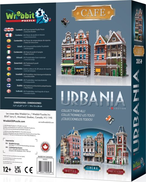 Postav si vlastní městečko se stylovými budovami! Poskládej si budovu kavárny, jednu ze čtyř částí z kolekce Urbania od kanadského výrobce Wrebbit. Vytvoř si tak vlastní městskou část, která se stane nevšedním doplňkem ložnice, obývacího pokoje i kanceláře. Roztřiďte, složte a vytvořte 3D model. Trojrozměrné puzzle WREBBIT kombinuje výzvu a zážitek. Puzzle se skládá podle referenčních obrázků na krabici a černobílého obrázkového návodu. Díky důmyslně navrhnutému tvaru a tloušťce dílků drží u sebe bez nutnosti lepení.