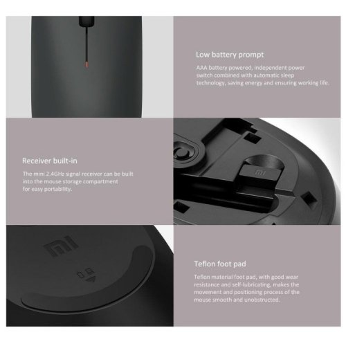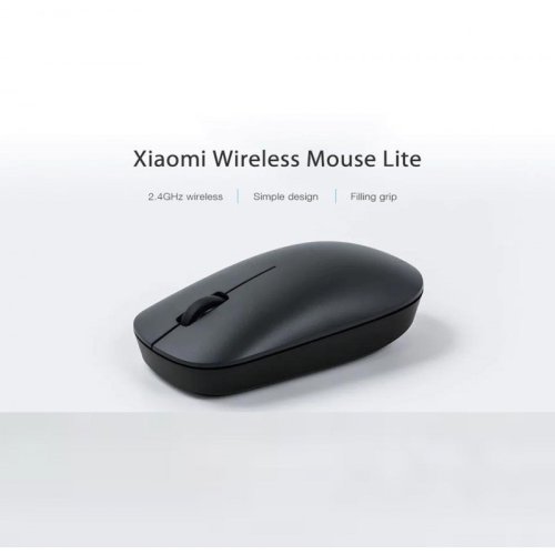 Xiaomi Wireless Mouse Lite Black - velmi jednoduchá bezdrátová myš, hmotnost pouhých 60g (bez baterií), přenos přes 2,4GHz pásmo a USB nano receiver (součástí balení, vejde se do myši), provoz na jednu AAA baterii (není součástí balení).