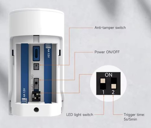 Bezdrátový infrapasivní detektor pohybu s odolností vůči zvířatům do 15 kg. Pracuje na frekvenci 433 MHz. Pro napájení detektoru slouží 2× AA baterie. Čidlo instalujte 2 až 2,2 m nad zemí.