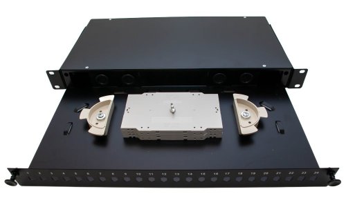 19" optický rozvaděč, pro 24 adaptérů ST, barva černá, kovová skříň, kazeta na 24 svarů. Vana výsuvná.
