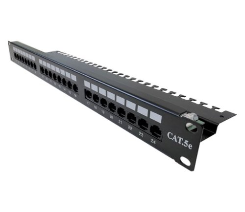 Propojovací panel, 24 portů RJ-45, kategorie Cat5e, 30u pozlacení, narážecí kontakty duálně normal/LSA, vyvazovací úchytky za panelem.
