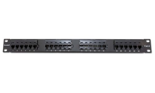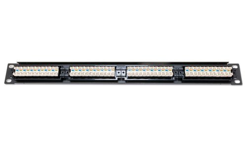 Propojovací panel, 24 portů RJ-45, CAT6, nestíněný, narážecí kontakty normal. Kontakty jsou na svorkovnici odlišeny barvami podle typu zapojení, a to buď podle T568A, nebo T568B nebo číselně značeny.
