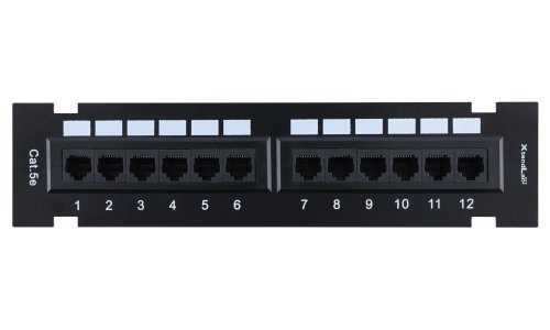 Propojovací patch panel na zeď se 12 porty RJ-45, Cat5e, narážecí kontakty. Čelní panel je snadno odnímatelný ze stěnového plastového rámečku.
