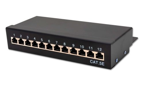 Patch panel pro 10" rozvaděče, výška 1U, 12 portů, Cat5e, stíněný. Zařezávací nože typu LSA, plechový kryt celého panelu, vyvazovací koncovky, zemnící vodič.