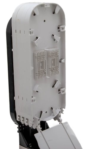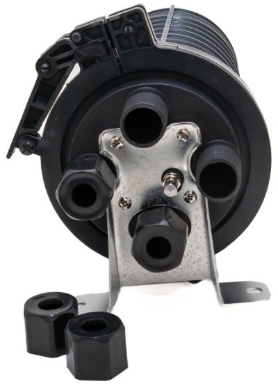 Vodotěsná spojka/rozvaděč hrncového typu. Určeno pro podzemní a nadzemní instalaci, součástí kompletní instalační příslušenství. Dodáváno včetně optických kazet pro maximální kapacitu pouzdra 96 vláken – 4 kazety po 12 svarech, přičemž do jedné pozice se umisťují 2 svary. Prostupy 4x kulatý otvor průměr 16 mm. Utěsnění kabelů zatažením matice s těsněním.
