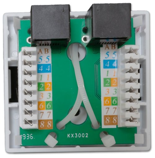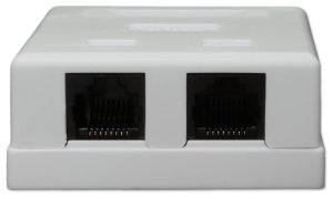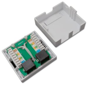 Nestíněná zásuvka na zeď se 2 konektory RJ-45, narážecí kontakty.